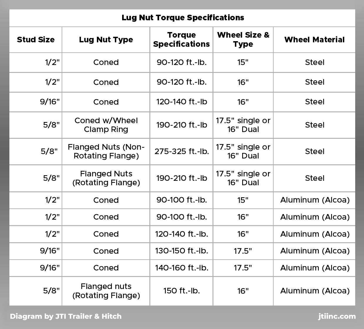 Lug Nut Torque Specifications Table for Trailer Wheels